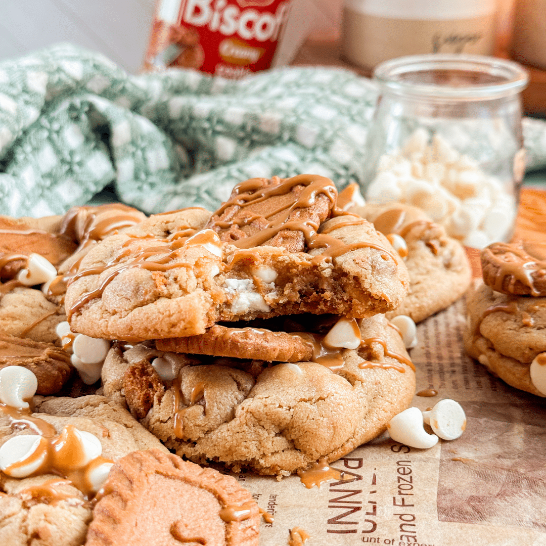 Biscoff cookie butter is made from spiced caramelized cookies, which means it brings warmth, sweetness, and depth all on its own. When you bake with it, it adds flavor and moisture, keeping cookies soft and chewy for days.